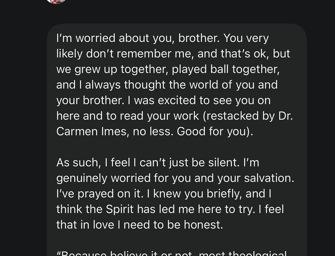 A few months ago a guy I grew up with sent me a message here on Substack. We played baseball together as kids. He said he used to think the world of me and my brother. He said he’d been praying about it and felt like he couldn’t stay silent. And then he told me he was genuinely worried about my salvation.
